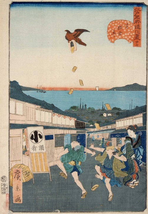 武士とそのお付きの頭上から、紐の切れた凧が落ちてきた瞬間を切り取った作品。なんといっても中央の従者の破顔ぶりが見事です。凧に引っ張られてか驚きのあまりか、はたまたその両方でしょうか、なんとも記憶に残る表情では無いでしょうか。