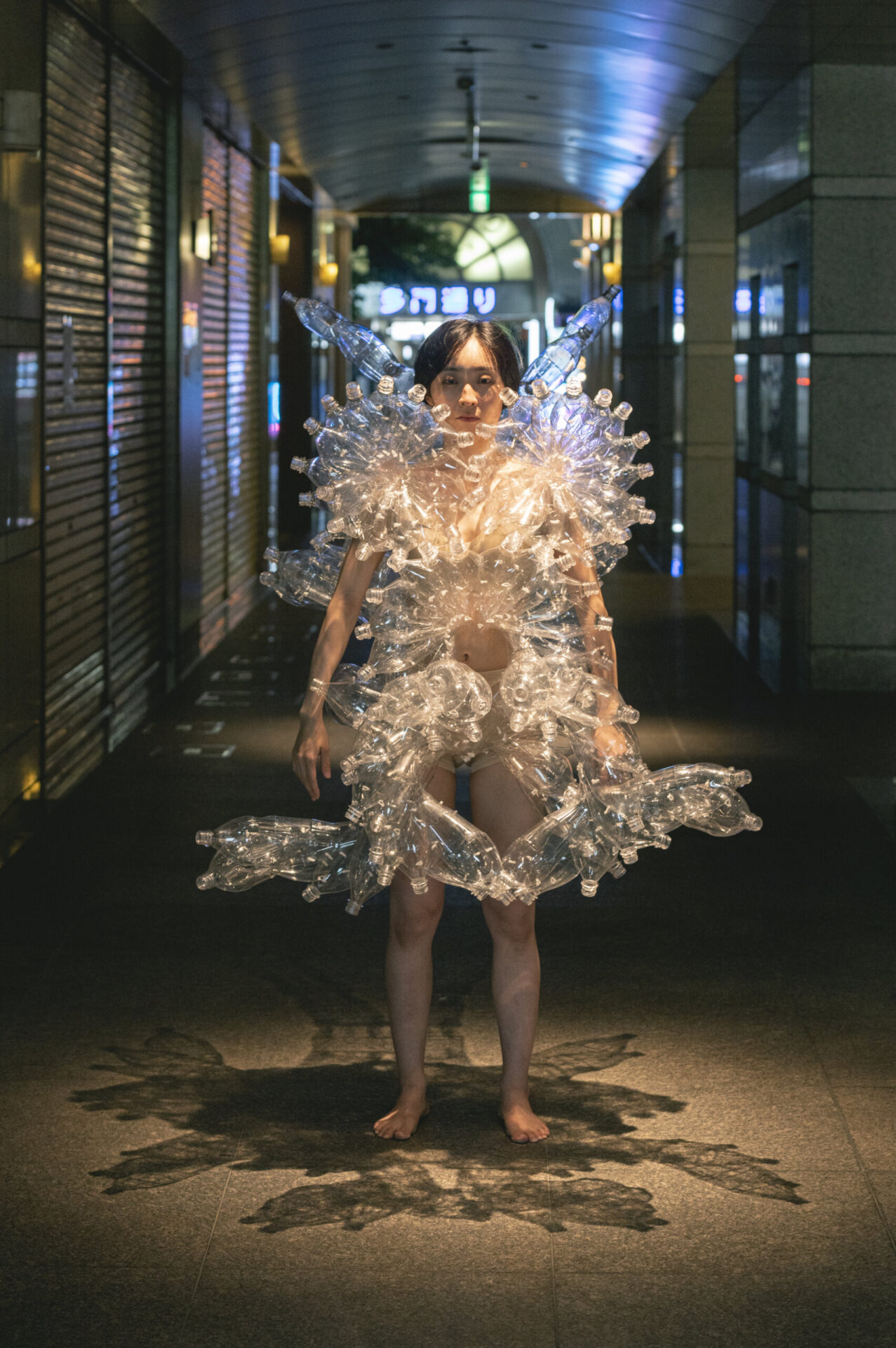 学生時代からコラボレーションを通して作品を常に進化させたリーロイですが、コロナ禍という制約された環境下で、自分にある挑戦をかけたといいます。コロナ禍のパンデミック時、できる限り素材を買いに行かず、そこにあるものを使うと決めまます。SNSで友達に連絡し、プラスチックボトルを回収するなどし、プラスチックボトルを活用したシリーズを作り出しました。