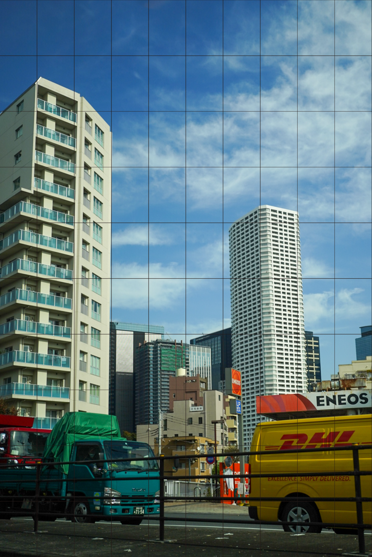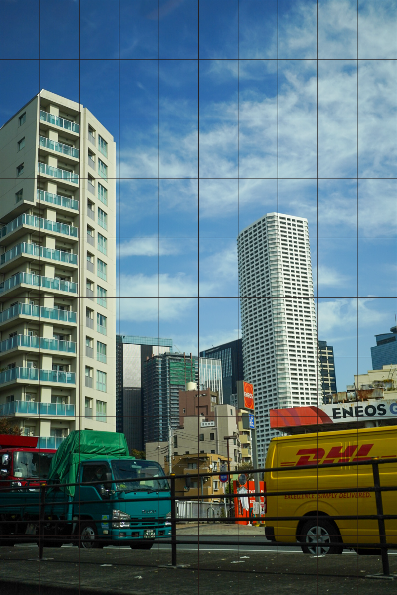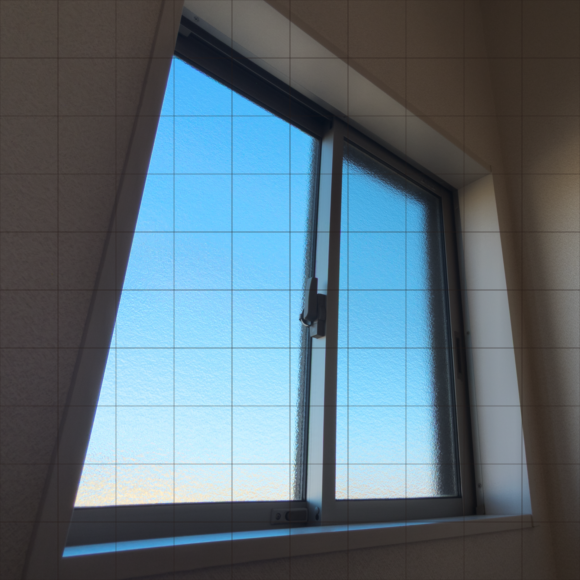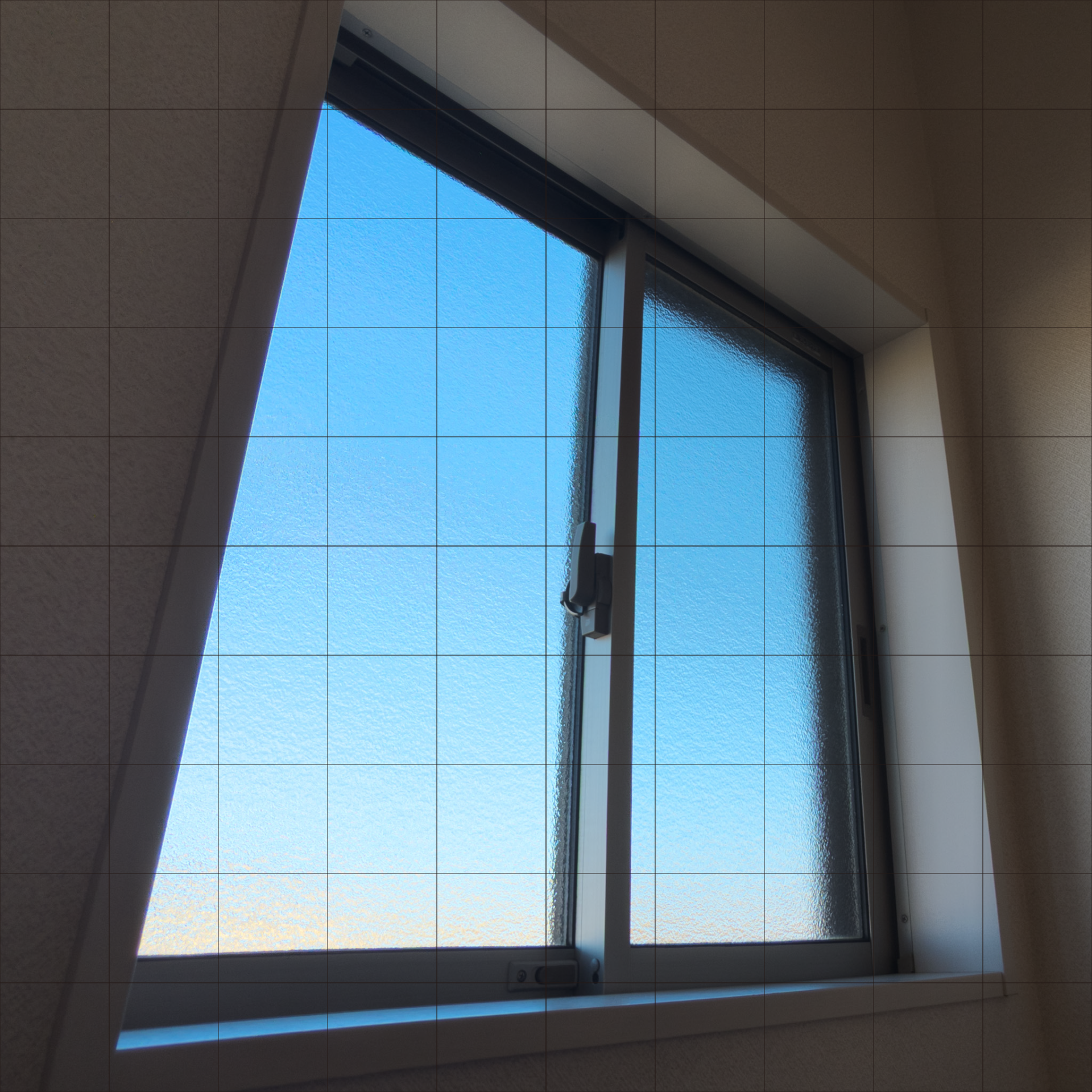 実際にレンズ補正をしてみると、一見変わらないようにも見えますが窓の中央の枠とグリッドとの距離が変化しており、歪みが補正されていることがわかります。